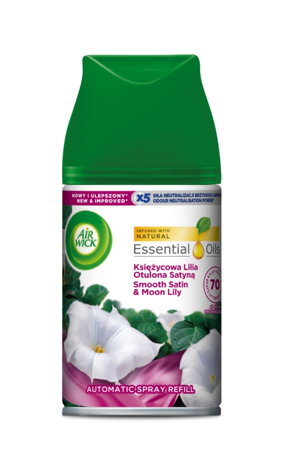 Delikatny dotyk satynowej pościeli. Jest lato. Można zasypiać przy otwartym oknie. Słychać kojące cykanie świerszczy i zaloty żab nad wodnym oczkiem. Ogród w pełnię księżyca wygląda tak bajkowo! Wieczorny wiaterek porusza kwiaty. Budzi zapachy naturalnych olejków - ponętnej piwonii, wytwornej róży i słodko-pikantnej wanilii. Czy pojawią się świetliki? A może jakaś zbłąkana wróżka? Wkład zapachowy Air Wick Freshmatic Księżycowa Lilia Otulona Satyną przeniesie Cię w świat snu nocy letniej i pozwoli odpocząć w relaksującym zapachu jak z bajki. Wkład Air Wick Freshmatic Księżycowa Lilia Otulona Satyną pasuje do automatycznego odświeżacza powietrza w aerozolu Air Wick Freshmatic. Urządzenie można łatwo ustawić na dowolnym meblu, a formuła nie zawiera wody, więc nie osiada na skórze i ubraniach. Po włączeniu urządzenie zadziała już po 15 sekundach, a później uwalnia zapach w zależności od tego, jak intensywny aromat wybierzesz – co 10, 25 lub 35 minut. Air Wick Freshmatic działa nawet przez 70 dni*.