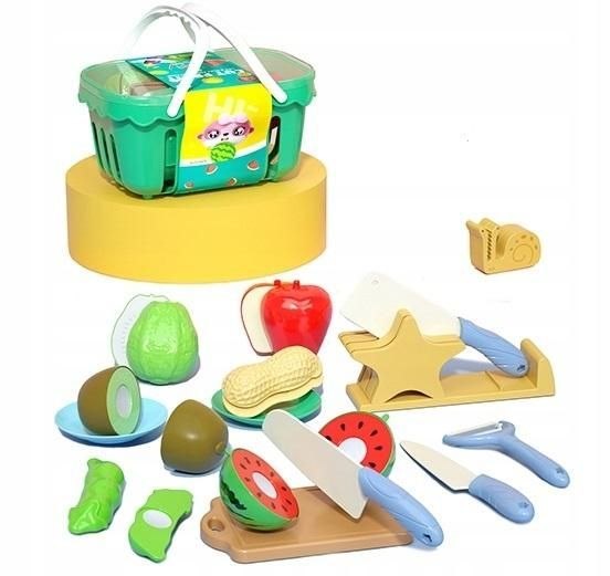 W zestawie: - 6 warzyw do krojenia - 2 talerzyki - 3 noże - obieraczka - deska - stojak na noże - uchwyt do noża - koszyk z uchwytem Funkcje: - zabawa polega na krojeniu warzyw tak, by rzepy łączące połówki rozdzielić Pozostałe informacje: - wymiary opakowania: 20,5 x 10 x 13 cm - wiek: 3+