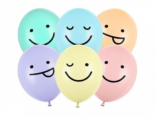 Balony Strong Buźki z nadrukami, zestaw zawiera 6 balonów(1 pastelowy w kolorze Light Mint z czarnym nadrukiem, 1 pastelowy w kolorze Light Lilac z czarnym nadrukiem, 1 pastelowy w kolorze Pale Pink z czarnym nadrukiem, 1 pastelowy w kolorze Light Peach z czarnym nadrukiem, 1 pastelowy w kolorze Light Yellow z czarnym nadrukiem, 1 pastelowy w kolorze Light Blue z czarnym nadrukiem), średnica ok. 30 cm.