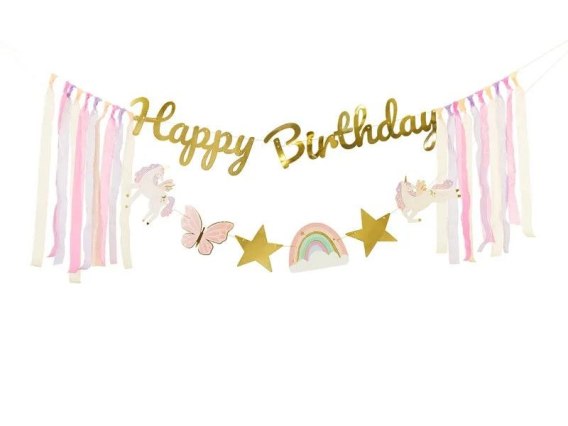 Baner Happy Birthday Jednorożce i inne kształty wykonane z papieru, mix kolorów, wymiary ok. 230 x 17.5 cm, długość sznurka ok. 4.4 m. Produkt do samodzielnego złożenia.