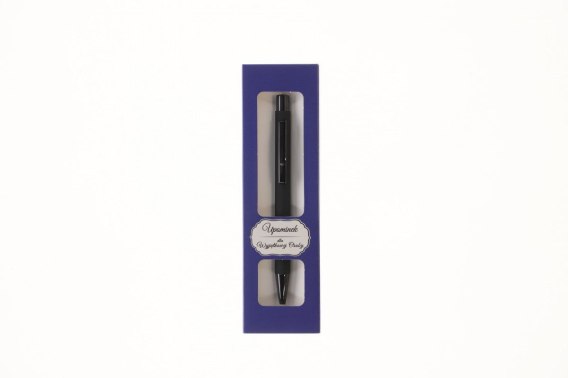 Długopis automatyczny CITY o wyjątkowym softowym korpusie w matowym czarnym kolorze z błyszczącymi wykończeniami. Długopis wyposażony został w wymienny wielkopojemnościowy wkład typu zenith o grubości 1mm linii pisania. Zapakowany w upominkowe etui GB.