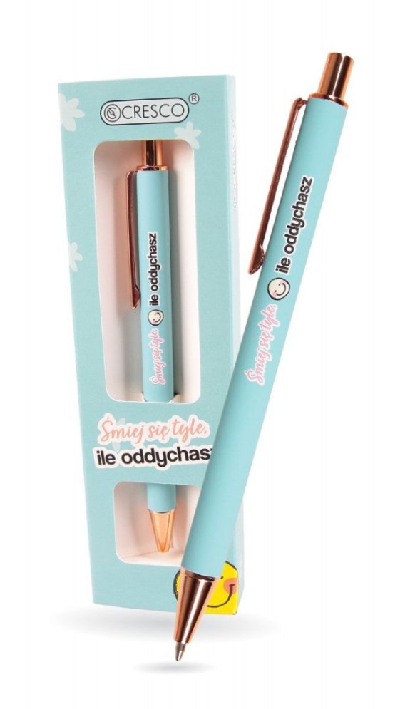 Długopis automatyczny z wymiennym wkładem 1mm. Kobieca kolorystyka, softowy, pastelowy korpus ze wykończeniami w odcieniach różowego złota. Nadruk na długopisie i pudełeczku to „Śmiej się tyle, ile oddychasz". Dodatkowo wzbogacony nadruk o wyjątkową grafikę. Długopis zapakowany w prezentowe etui GB, w sam raz na upominek dla NIEJ.Nieodpowiednie dla dzieci poniżej 3 lat. Sugerowany wiek +5. Ostre zakończenia. Ryzyko zranienia oka. Zawiera małe elementy. Ryzyko połknięcia, zadławienia, uduszenia. Do użytku pod nadzorem osoby dorosłej.