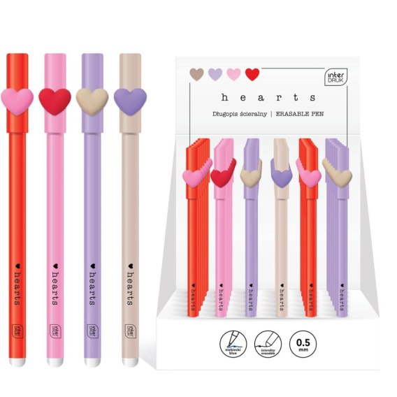 Długopis ścieralny zamykany na skuwkę z serduszkiem. Grubość pisania: 0.5 mm. Niebieski wkład. Zakończony gumką, która umożliwia szybką i estetyczną korektę napisanego tekstu, bez użycia korektora czy przekreślania. Miłe w dotyku wykończenie soft touch. 4 wzory do wyboru. 36 szt. w displayu.