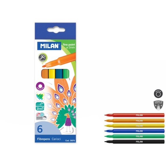Flamastry z cienką końcówką o średnicy 2 mm. Szczególnie nadają się do rysowania konturów i pisania krótkimi pociągnięciami. Tusz na bazie wody tworzy jaskrawe i intensywne kolory, które można ze sobą mieszać. Tusz można łatwo wyprać z większości tkanin (moczyć tkaninę w zimnej wodzie przez godzinę, a następnie prać w pralce w niskiej temperaturze). Końcówka odporna na mocne przyciśnięcia. Bezpieczna wentylowana skuwka umożliwia oddychanie w przypadku połknięcia. Flamastry MILAN są zgodne z europejskimi i amerykańskimi normami bezpieczeństwa. Nie zawierają ftalanów, metali ciężkich i innych substancji toksycznych. Są bezpieczne dla dzieci. Rozmiar flamastra: 15,3 x ø 0,8 cm. Rozmiar opakowania: 18,8 x 6,4 x 1,2 cm.