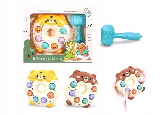 GRA ZRĘCZNOŚCIOWA TRAF MŁOTKIEM ROBAKA WBIJANKA DONUT + MŁOTEK Gra zręcznościowa uderz robaka to rewelacyjna gra, która rozwija refleks, spostrzegawczość, zdolności manualne oraz zmysł wzroku. Gra polega na jak najszybszym uderzeniu robaka, który pojawia się w różnych miejscach. Przyjazne i ciepłe kolory oraz wygodny w uchwyceniu młotek zachęcą każdego malucha do zabawy.