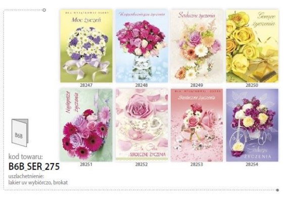 - kartki dostępne w różnych wzorach - aranżacje z wykorzystaniem kwiatów, graficzne lub dziecięce