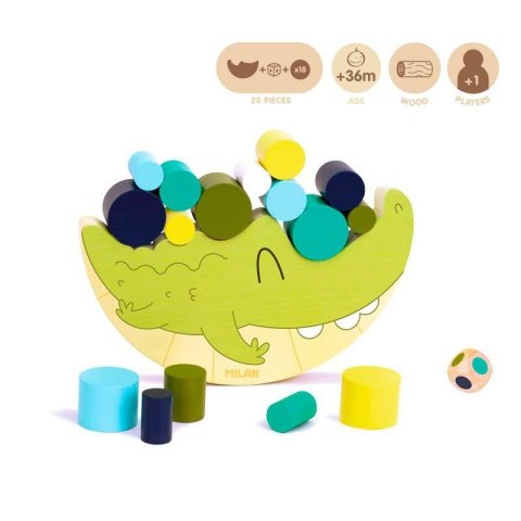 Drewniana zabawka edukacyjna ""Balansujący krokodyl"". Celem gry jest ułożenie kolorowych elementów na podstawie krokodyla. Zawiera figurkę w kształcie krokodyla, kostkę do gry i 18 cylindrycznych elementów. Od 1 do 6 graczy. Zachęca do obserwacji, rozwoju równowagi i koncentracji. Zalecana od 3 roku życia.