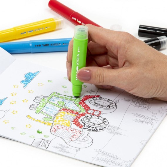 Malowanie kropkami to wyjątkowa kolorowanka, w której obrazki tworzone są za pomocą małych kropek. Zestaw Kidea zawiera kolorowankę z 10 arkuszami z obrazkami przeróżnych pojazdów oraz 5 kolorów dwustronnych flamastrów ze stempelkami: czerwony, zielony, niebieski, żółty i czarny. Końcówka flamastrów jest zaokrąglona i krótka, co ułatwia malowanie kropek na obrazkach. Stempelki na drugiej końcówce pisaka są samotuszujące, dzięki czemu nie trzeba używać dodatkowej poduszki z tuszem, a w dodatku mają ciekawe wzory, takie jak gwiazdki i listki. Malowanie kropkami to technika, która rozwija u dziecka koordynację ręka-oko, poprawia sprawność manualną, uczy koordynacji, a przede wszystkim rozwija wyobraźnię.