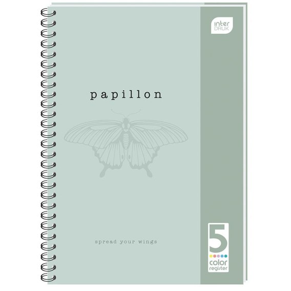 Format: B5. Liczba kartek: 160. Zadruk w kratkę. Ostre rogi. Podwójna spirala zamykana. Otwory do segregatora. Perforacja wzdłuż grzbietu, ułatwiająca wyrywanie kartek. Spirala po długim boku. W środku 5 kolorowych, wycinanych registrów.