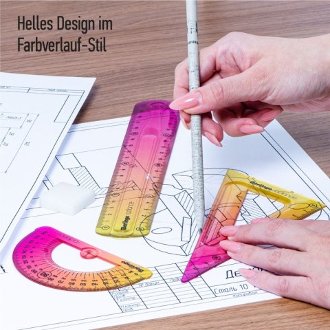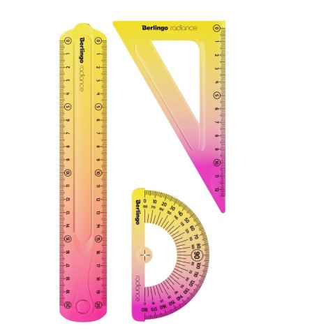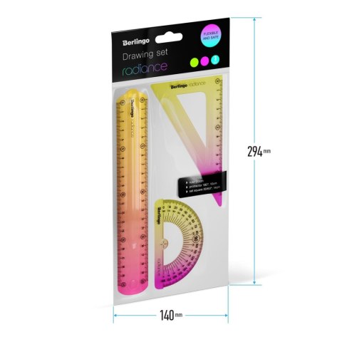 Opakowanie zawiera 3 szt. wysokiej jakości przyborów geometrycznych do kreślenia Berlingo opakowanych w ergonomiczny, wytrzymały, blister z zawieszką. Przybory te są uniwersalnym narzędziem w szkole, pracy oraz jako narzędzie DIY. Zestaw składa się z cyrkla, ekierki oraz kątomierza.