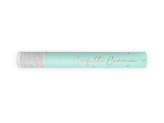 Tuba strzelająca bibułowym konfetti w kolorze różowego złota, długość ok. 40 cm.