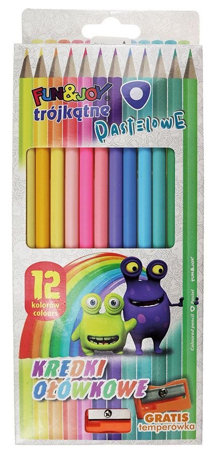 Trójkątne kredki ołówkowe o delikatnych pastelowych kolorach. 12 kolorów w kartonowym pudełku. Temperówka w zestawie. Długość kredek: 17,5 cm., średnica kredki: 7 mm.
