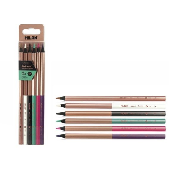 Kredki ołówkowe, sześciokątne, cienkie z bardzo grubym grafitem o średnicy 3,5 mm. Wykonane z czarnego lipowego drewna. Obudowa kredek nawiązuje do kolekcji COPPER. W zestawie 6 kredek w kolorach: miedzianym, białym, czarnym, zielonym, różowym i fioletowym. Posiadają unikalny system Lead Protection System (LPS), który zwiększa odporność grafitu na złamania poprzez przyklejenie go do drewna. Drewno jest wytrzymałe i miękkie umożliwiając łatwe temperowanie. Wysokiej jakości pigmenty w żywych, intensywnych kolorach są odporne na działanie światła. Kreska wykonana kredką MILAN jest miękka, jednolita o wyraźnym odcieniu. Nie tworzy rowków ani nie niszczy papieru. Drewno pochodzi ze zrównoważonych plantacji. Każda kredka ma nadrukowaną nazwę koloru po angielsku. Kredki MILAN są zgodne z europejskimi i amerykańskimi normami bezpieczeństwa. Nie zawierają ftalanów, metali ciężkich i innych substancji toksycznych. Są bezpieczne dla dzieci. Rozmiar kredki: 17,5 x ø 0,62 cm. Rozmiar opakowania: 21,8 x 4,4 x 0,8 cm.
