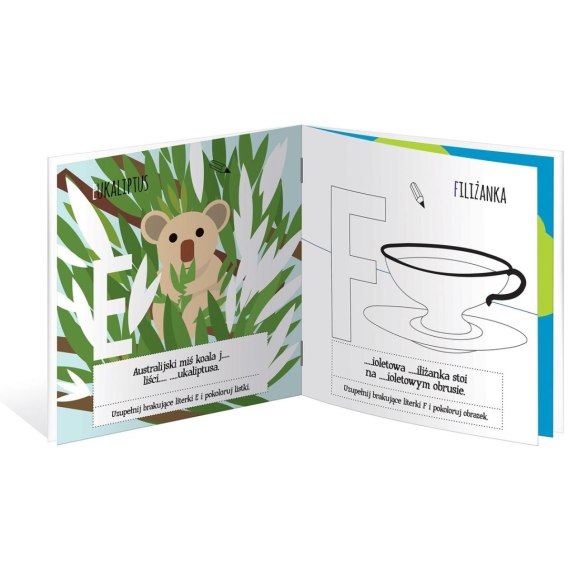 Książeczka zawiera 32 strony (w formacie 210x210) z literami oraz 2 strony z naklejkami. Zadaniem dziecka jest odszukanie właściwej naklejki pasującej do ilustracji oraz wykonanie zadania. W serii „Mój pierwszy elementarz" dostępne są także: „Cyfry", „Figury" oraz „Kolory".