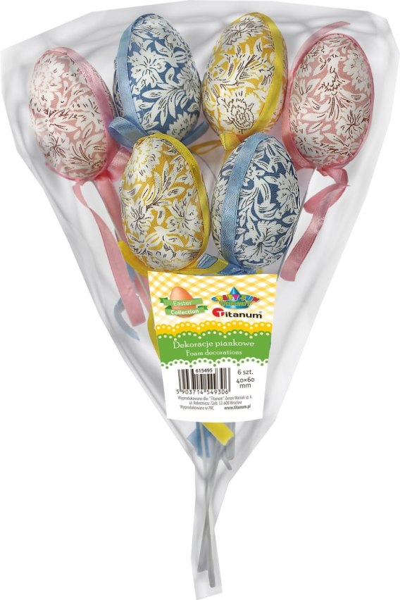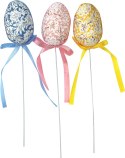 Jajka styropianowe 38 x 58 mm, z dekoracją materiałową w kwiaty i wstążką, na piku, 3 kolory: różowy, żółty, niebieski. 6 sztuk.