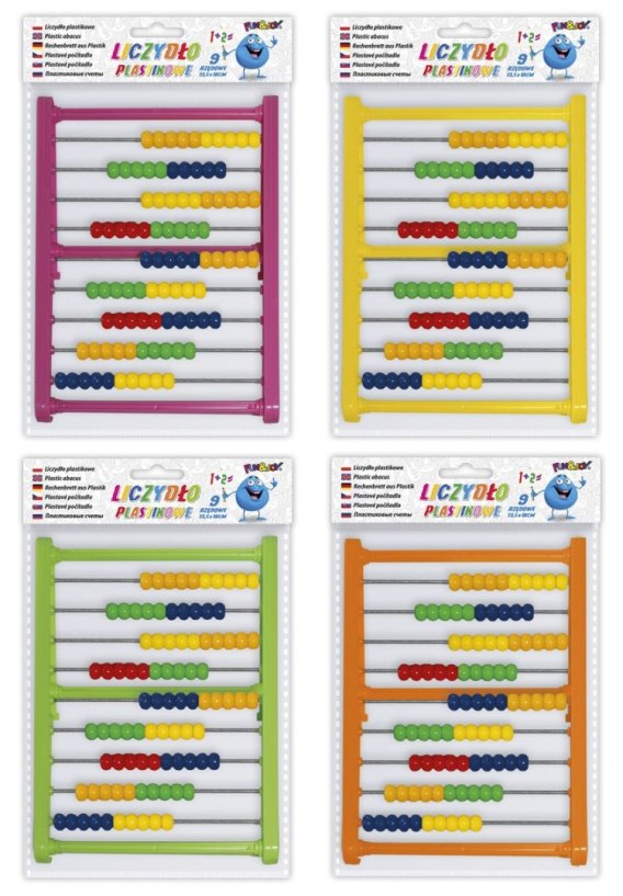 9-rzędowe liczydło plastikowe z stabilną podpórką. Wymiary: 13,5 x 18 cm. Dostępne 4 kolory. Pakowane w woreczek z zawieszką. Kolory wydawane losowo.