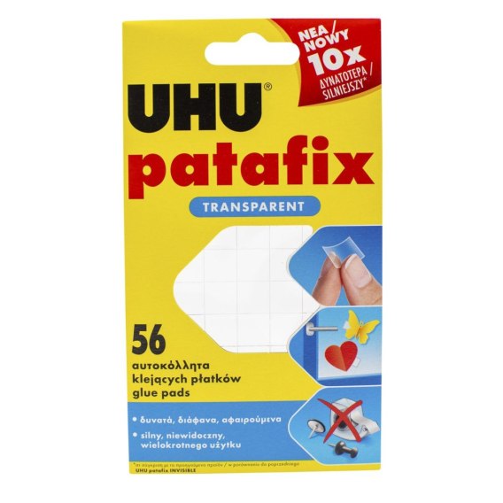 Dwustronne listki klejące UHU Patafix Invisible 56 bezbarwnych porcji. Do szybkiego i czystego mocowani małych przedmiotów do różnych powierzchni, takich jak drzwi, okna lub meble. Idealny do tworzenia kolaży, nalepek na okno, kartek oklicznościowych i fotoalbumów. Niewidoczne na szkle, usuwalny z większości gładkich powierzchni. Nieodpowiednie do delikatnych powierzchni i materiałów. Miejsca do sklejenia muszą być suche i odtłuszczone oraz bez kurzu. Nie używać na ostatnio malowanych powierzchniach i tapetach.