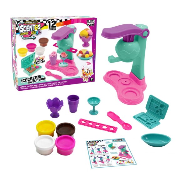 - w zestawie 12 elementów: zabawkowa maszynka do tworzenia ciastolinowych lodów, 3 zabawkowe naczynia do serwowania, 1 zabawkowa łyżka, 1 zabawkowa miseczka, wytłaczarka, foremka z kształtami owoców i 4 kubeczki z pachnącą ciastoliną (w różnych kolorach);