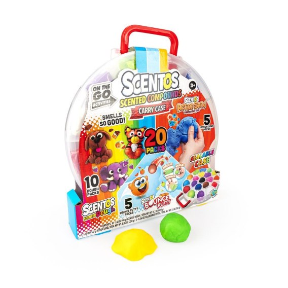 - zestaw zawiera 20 zapachowych mas plastycznych: 10 kulek ciastoliny, 5 kulek odbijającej się masy i piasek kinetyczny w 5 kolorach; całość zapakowana w praktyczną walizkę;