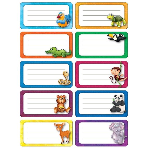 Zestaw papierowych naklejek na zeszyty. Na arkuszu znajduje się 10 naklejek. Naklejki posiadają zaokrąglone rogi. Wymiary naklejki: 38x75 mm. Wymiary arkusza: 230x160 mm. Opakowanie zawiera 24 arkusze (po 12 arkuszy z 2 wzorów).