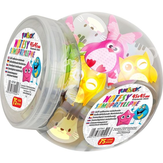 Karteczki samoprzylepne, idealne do pozostawienia wiadomości zarówno w biurze jak i w domu. Oryginalne wzory w delikatnych, pastelowych kolorach nie pozwalają przeoczyć pozostawionej karteczki z informacją. Dedykowane dla dzieci i młodzieży. Nie pozostawiają śladu kleju na powierzchni i można je wielokrotnie odrywać i przyklejać. Występują w 5 wzorach: sowa, motyl, kot, kwiat, pingwin. W bloczku 50 karteczek w rozmiarze 45 x 45 mm. Pakowane w plastikowy słoik: 75 sztuk.