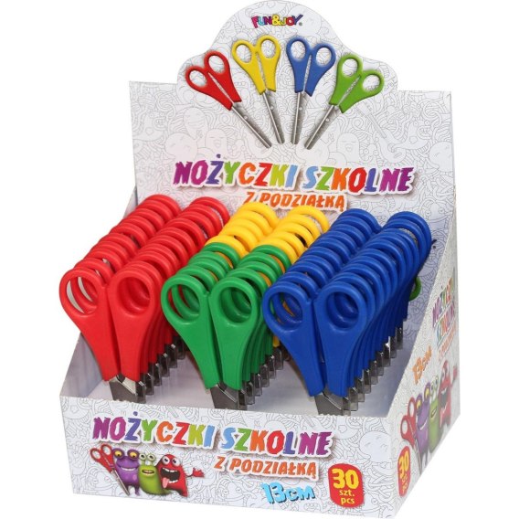 Nożyczki szkolne z podziałką zaokrąglone końce, długość ostrza: 58 mm, długość nożyczek: 130 mm. Dostępne w 4 kolorach. Kolory wydawane losowo.