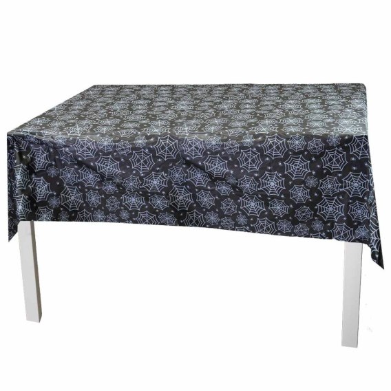 Obrus z nadrukiem pajęczyn to efektowna dekoracja stołu na Halloween. Czarny materiał ozdobiony białym wzorem pajęczyn i pająków wprowadza mroczny klimat idealny na tematyczne przyjęcia, imprezy halloweenowe czy dekorację sali zabaw. Dzięki dużemu rozmiarowi doskonale sprawdzi się na większości stołów, zarówno w domu, jak i w lokalach gastronomicznych czy na eventach.