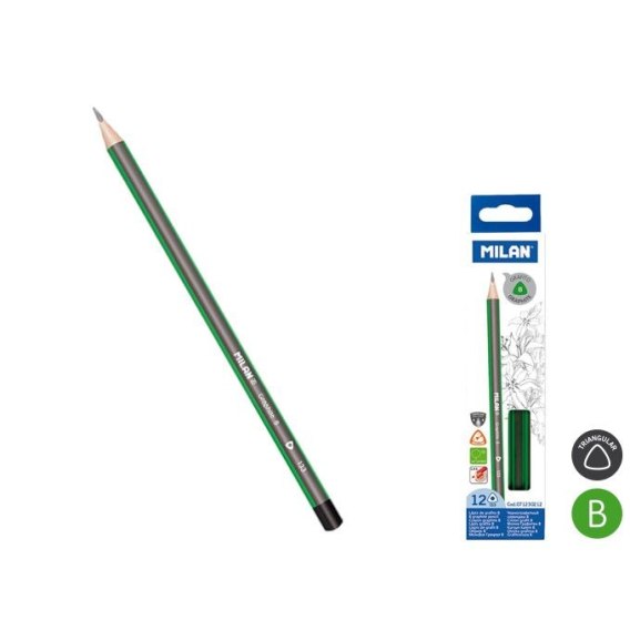 Ołówki trójkątne B. Grafit B jest średnio miękki i jest zalecany do pisania i rysowania. Posiadają unikalny system Lead Protection System (LPS), który zwiększa odporność grafitu na złamania poprzez przyklejenie go do drewna. Drewno pochodzi ze zrównoważonych plantacji. średnica grafitu: 2,4 mm. Wymiary ołówka: 17,5 x ø 0,62 cm.