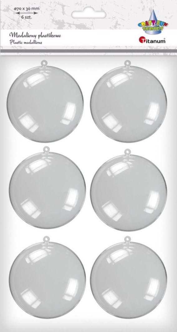 Plastikowe dekoracje 3D z przezroczystego plastiku, składające się z dwóch części, z uchwytem umożliwiającym zawieszenie za pomocą wstążki, sznurka lub haczyka. Można je dowolnie malować i oklejać, zarówno wewnątrz jak i na zewnątrz lub użyć jako bazy pod bombkę wykonaną na szydełku. Idealne do tworzenia ozdób na różne okazje jak: Boże Narodzenie, Wielkanoc, chrzciny czy wesela. Jedne z najpopularniejszych elementów wykorzystywanych w technice decoupage. Kształt: medalion - płaski z jednej strony. Średnica 70 mm, grubość 30 mm.