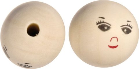 Koraliki drewniane, okrągłe, z nadrukiem twarzy, średnica 30 mm, średnica otworu 6 mm, naturalne drewno. 4 sztuki.