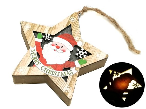 Zawieszka świąteczna, drewniana, gwiazda, ze swiatłęm LED; 10x10cm