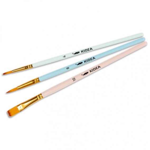 Pędzle szkolne pastelowe 3 szt. Kidea ędzle do malowania Kidea z końcówką z naturalnym włosiem w 3 rozmiarach: 10, 8 i 4. Końcówki o różnych wielkościach i kształtach idealnie sprawdzą się podczas malowania detali, tła czy mieszania kolorów na płótnie. Pastelowe kolory trzonów wyróżniają je spośród innych pędzli i pieknie prezentują się w szkolnym piórniku lub na biurku.