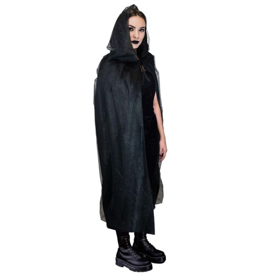 Stylowa peleryna z kapturem to efektowny dodatek do halloweenowych przebrań i wieczornych stylizacji. Uszyta z dwóch warstw materiału - kryjącej bazowej oraz prześwitującej zewnętrznej, na której znajdują się subtelne drobinki brokatu, które delikatnie połyskują przy ruchu i świetle.