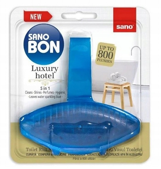 SANOBON Zawieszka barwiąca do muszli WC 5w1 Zapobiega gromadzeniu sie kamienia i czyści muszle klozetową przy każdorazowym użyciu. Pozostawia świeży i przyjemny zapach oraz barwi i pieni wode.