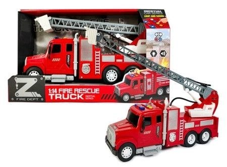 AUTO STRAŻ POŻARNA W SKALI 1:14, WODA, ŚWIATŁO, DŹWIĘK, pak 32, wymiary auta: 10,5 x 31 x 18,5 cm jeżdzi manualnie,podnoszona drabina, psika wodą, 4 guziki na kabinie. wymiar pudełka: 19,5 x 12 x 35,5 cm