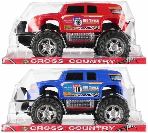Zalety produktu: rozwijanie wyobraźni dziecka, funkcja pull&back dzięki czemu po pchnięciu samochód kontynuuje jazdę samodzielnie, występuje w dwóch wersjach kolorystycznych. Terenowe samochody nigdy nie wyjdą z mody. Lubią się nimi bawić zarówno dzieci, jak i dorośli pasjonaci motoryzacji! Zawartość zestawu: samochód terenowy . Produkt wykonany z plastiku. Wymiary/waga/baterie: wymiary produktu (dł. x wys. x gł.)[cm]:47x23x28, waga produktu bez opakowania [kg]: 0,94 kg, Wymiary opakowania (dł. x wys. x gł.) {cm} 3x21x22, waga produktu w opakowaniu [kg]: 1,11 kg, Nie wymaga zasilania bateriami. Zabawka przeznaczona dla dzieci w wieku: 3+. Pakowana w przezroczysty kartonik. W kartonie zbiorczym po 6/12szt.