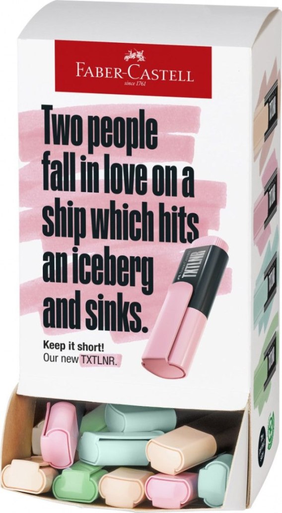 Display z zakreślaczami min TXTLNR Faber-Castell 60 szt. mix kolorów pastelowych od Faber-Castell. Wysokiej jakości pastelowe kolory, idealne do zaznaczania, podkreślania i wyróżniania. Odpowiednie do wszystkich rodzajów papierów. Uniwersalny tusz na bazie wody. Odporne na rozmazywanie. Ze ściętą końcówką o szerokości linii pisania 1 - 5 mm. Dostępne w różnych kolorach i zestawach.