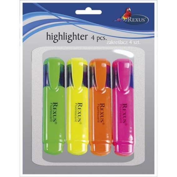 Zakreślacze 4 szt. bardzo przydatne do wyróżnienia w tekście istotniejszych fragmentów. Kolory: cytrynowy, pomarańczowy, różowy i zielony.