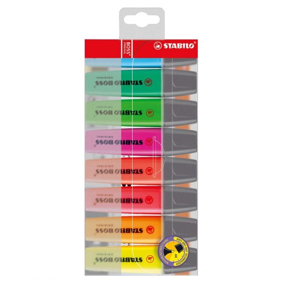 Numer 1 na świecie! Niedościgniony klasyk od 1971 roku. W każdej sekundzie sprzedają się 2 zakreślacze BOSS w Europie. Zakreślacz fluorescencyjny z tuszem na bazie wody do pisania na wszystkich rodzajach papieru (również faksowym i samokopiującym). Pozostawiony bez skuwki nie zasycha nawet przez 4 godziny, a po zamknięciu ma właściwości regeneracyjne. Jedyny zakreślacz dostępny aż w 15 kolorach w tym w pastelowych. Szerokość linii od 2 do 5 mm. Plastikowe etui z zawieszką zawierające 8 szt. w kolorach: 24, 31, 33, 40, 51, 54, 56, 58.