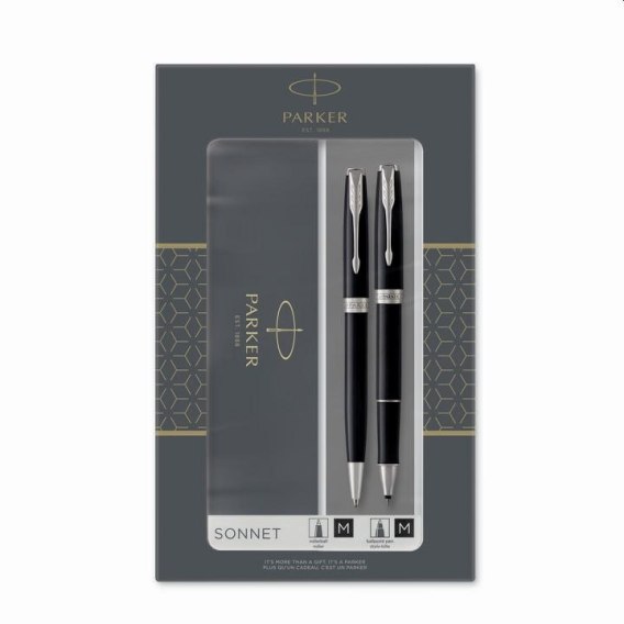 Zestaw podwójny PARKER Sonnet, zawierający czarne długopis i pióro kulkowe z chromowanym wykończeniem oraz opakowanie podarunkowe marki Parker, to ponadczasowy prezent, by uczcić niezwykle szczególny moment. Seria Sonnet, będąca klasycznym wyrazem wyrafinowanego stylu, jest symbolem elegancji marki Parker. Dzięki szerokiej gamie stylów, każdy misterny szczegół jest kunsztownie wykonany, aby każda okazja do pisania nabrała wyjątkowego wyrafinowania. Długopis został wyposażony w wysuwany mechanizm obrotowy oraz końcówkę medium, by pisało się prościej i z większą płynnością; kompatybilny z atramentem długopisów oraz tuszem żelowym długopisów PARKER QUINK. Pióro wieczne wyposażono w cienką końcówkę ze stali szlachetnej, by zapewnić wyraźny i piękny styl pisma; wyposażone w nabój z czarnym atramentem Quink Każdy detal zapewnia niesamowite wrażenia podczas pisania, zgodnie z ponad 125-letnią tradycją marki PARKER.