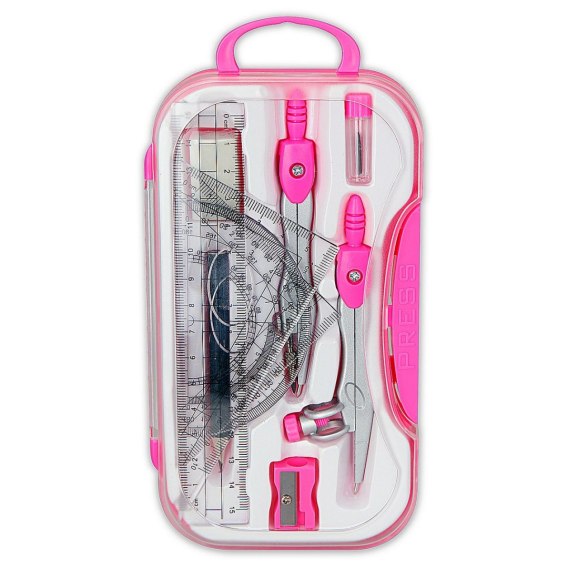 Zestaw składający się z dwóch cyrkli: metalowego z grafitem 2 mm oraz z ołówkiem kompletu geometrycznego, temperówki i pojemnika na zapasowe grafity. Całość w kolorowym etui z zawieszką.