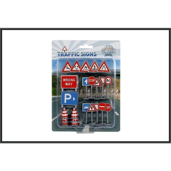 W zestawie : znaki drogowe 10szt. po 5cm , 5szt. po 5cm , tablice ostrzegawcze 4szt.o wymiarach 3x3,5cm oraz pachołki 6szt. po 2,5cm.